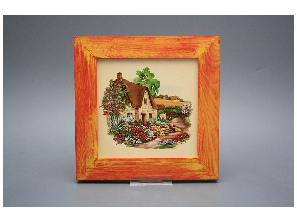 Keramisches Bild zum Aufhängen mit Holzrahmen, Temperatur beim Ausbrennen des Motivs in Höhe von 820°C, abriebfestes, waschbares Dekor.