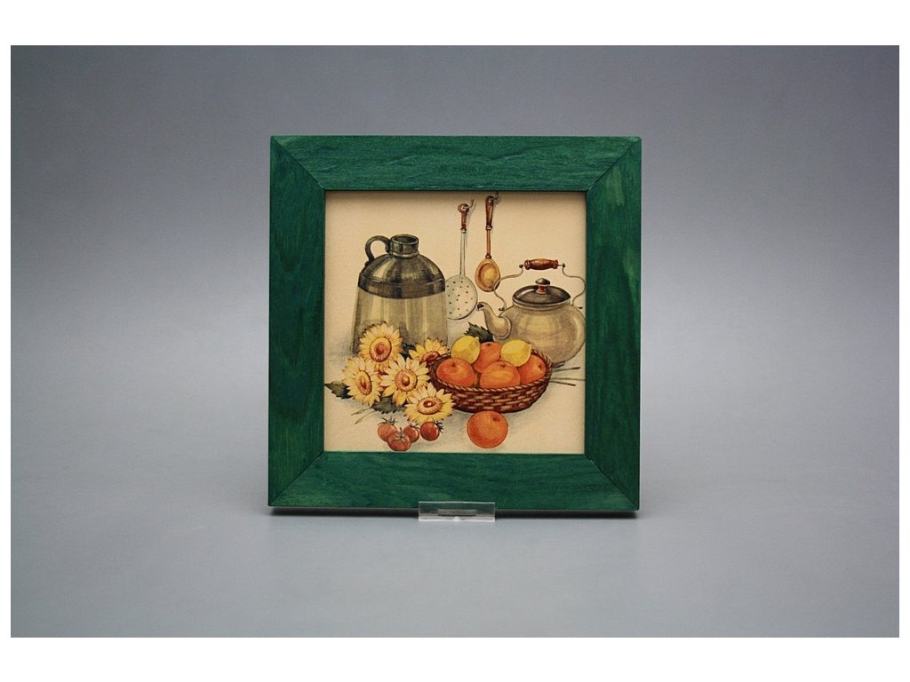 Keramisches Bild zum Aufhängen mit Holzrahmen, Temperatur beim Ausbrennen des Motivs in Höhe von 820°C, abriebfestes, waschbares Dekor.