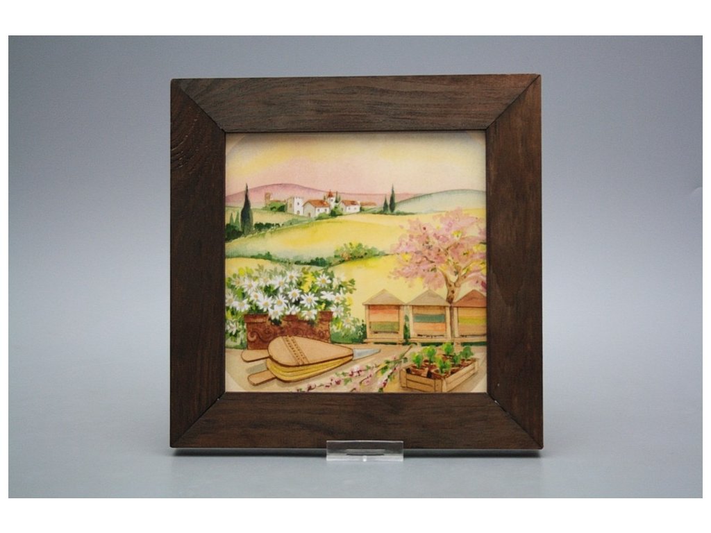 Keramisches Bild zum Aufhängen mit Holzrahmen, Temperatur beim Ausbrennen des Motivs in Höhe von 820°C, abriebfestes, waschbares Dekor.