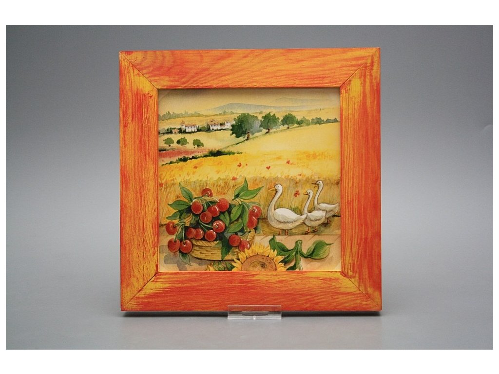 Keramisches Bild zum Aufhängen mit Holzrahmen, Temperatur beim Ausbrennen des Motivs in Höhe von 820°C, abriebfestes, waschbares Dekor.