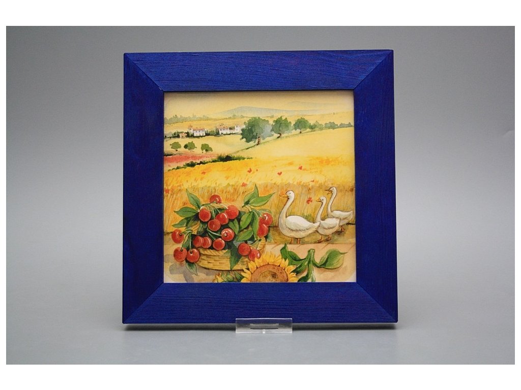Keramisches Bild zum Aufhängen mit Holzrahmen, Temperatur beim Ausbrennen des Motivs in Höhe von 820°C, abriebfestes, waschbares Dekor.