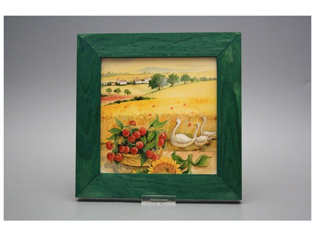 Keramisches Bild zum Aufhängen mit Holzrahmen, Temperatur beim Ausbrennen des Motivs in Höhe von 820°C, abriebfestes, waschbares Dekor.