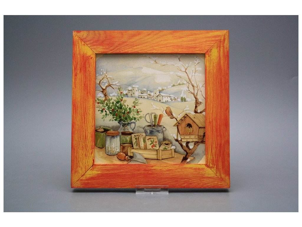 Keramisches Bild zum Aufhängen mit Holzrahmen, Temperatur beim Ausbrennen des Motivs in Höhe von 820°C, abriebfestes, waschbares Dekor.