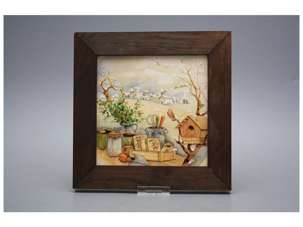 Keramisches Bild zum Aufhängen mit Holzrahmen, Temperatur beim Ausbrennen des Motivs in Höhe von 820°C, abriebfestes, waschbares Dekor.