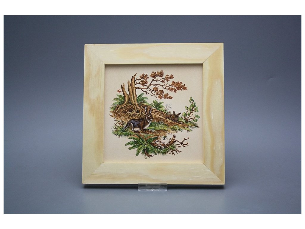 Keramisches Bild zum Aufhängen mit Holzrahmen, Temperatur beim Ausbrennen des Motivs in Höhe von 820°C, abriebfestes, waschbares Dekor.