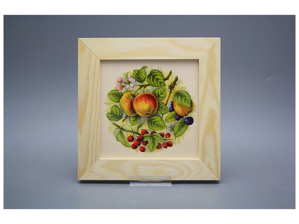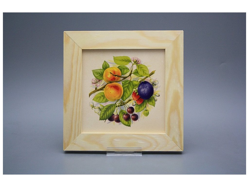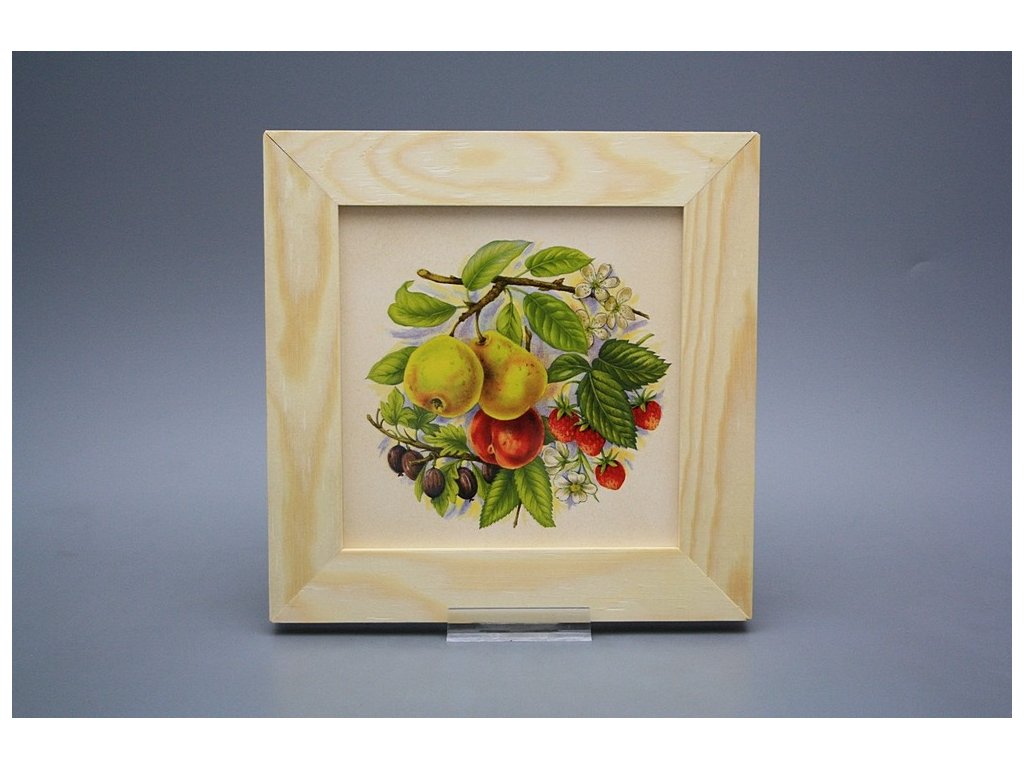 Keramisches Bild zum Aufhängen mit Holzrahmen, Temperatur beim Ausbrennen des Motivs in Höhe von 820°C, abriebfestes, waschbares Dekor.