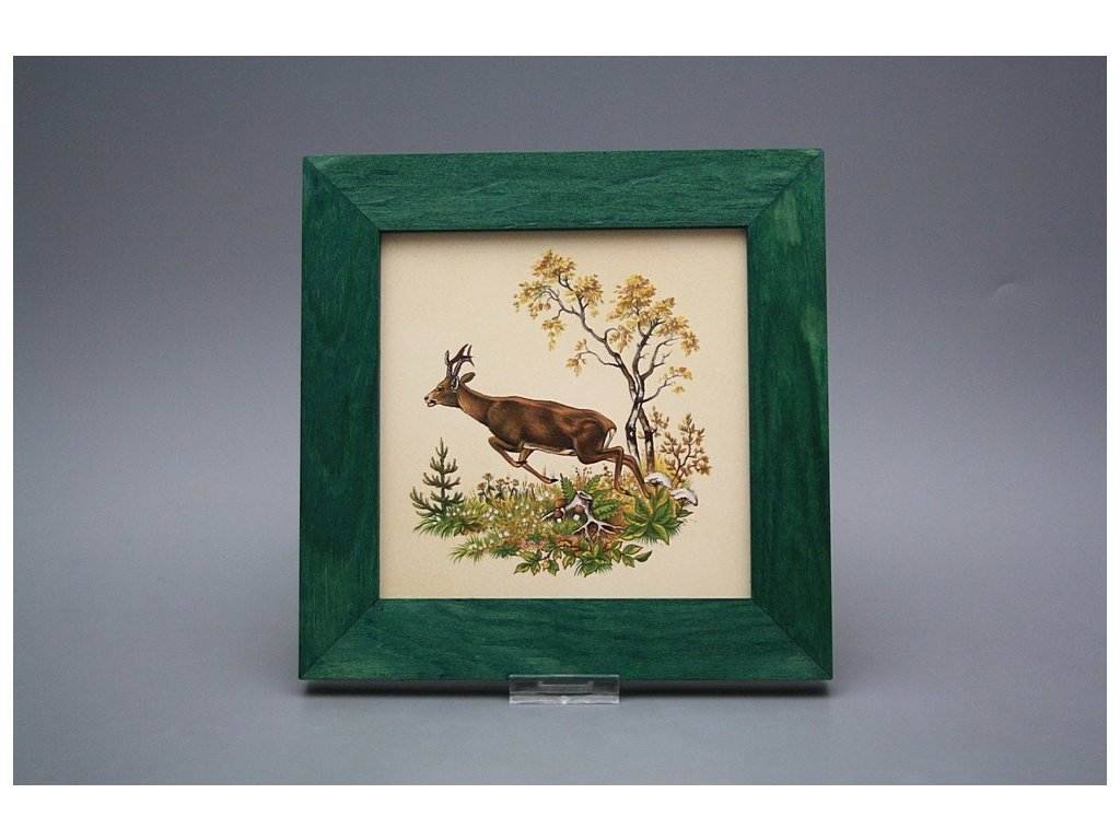 Keramisches Bild zum Aufhängen mit Holzrahmen, Temperatur beim Ausbrennen des Motivs in Höhe von 820°C, abriebfestes, waschbares Dekor.