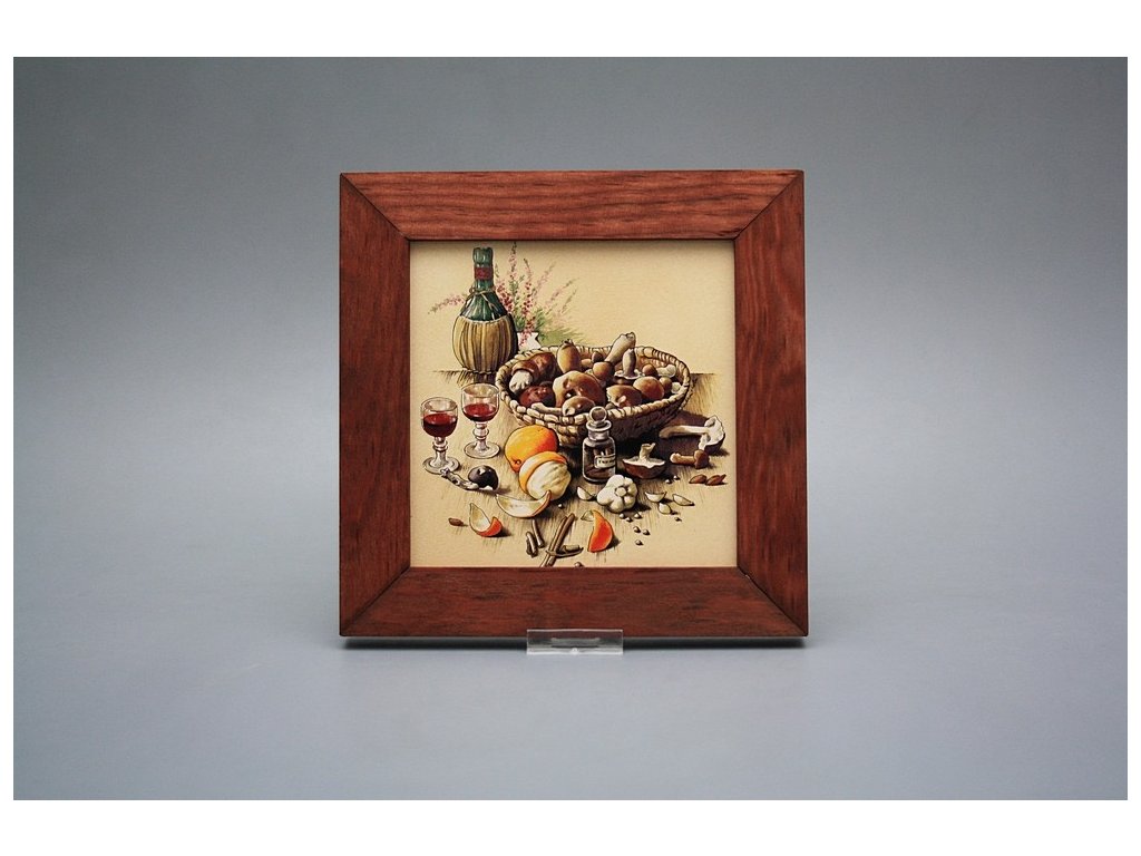 Keramisches Bild zum Aufhängen mit Holzrahmen, Temperatur beim Ausbrennen des Motivs in Höhe von 820°C, abriebfestes, waschbares Dekor.