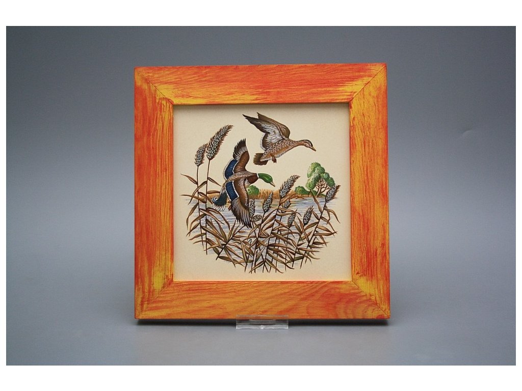 Keramisches Bild zum Aufhängen mit Holzrahmen, Temperatur beim Ausbrennen des Motivs in Höhe von 820°C, abriebfestes, waschbares Dekor.
