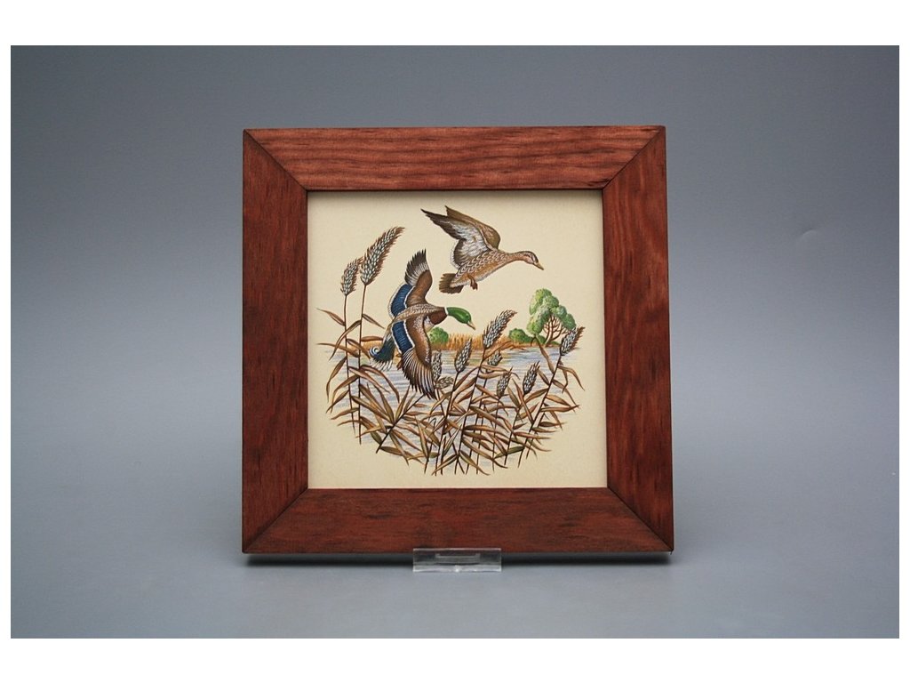 Keramisches Bild zum Aufhängen mit Holzrahmen, Temperatur beim Ausbrennen des Motivs in Höhe von 820°C, abriebfestes, waschbares Dekor.
