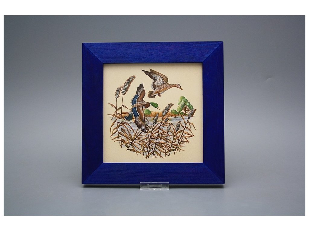 Keramisches Bild zum Aufhängen mit Holzrahmen, Temperatur beim Ausbrennen des Motivs in Höhe von 820°C, abriebfestes, waschbares Dekor.