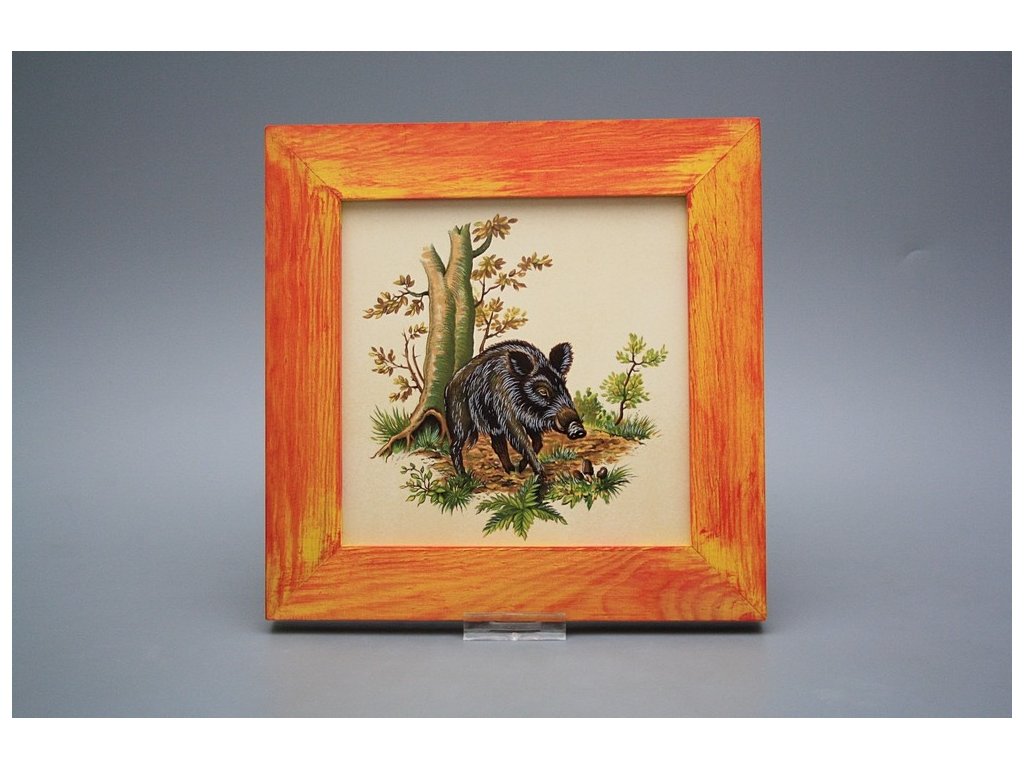 Keramisches Bild zum Aufhängen mit Holzrahmen, Temperatur beim Ausbrennen des Motivs in Höhe von 820°C, abriebfestes, waschbares Dekor.