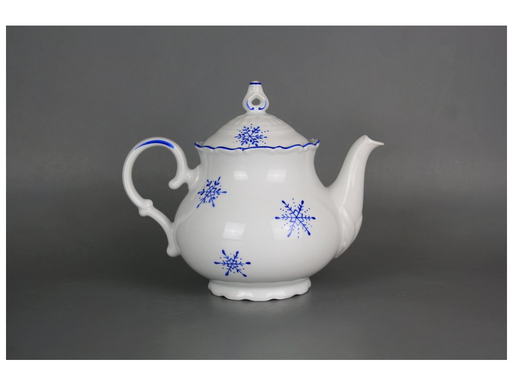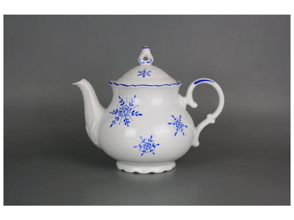 Ručně malovaná čajová konvice 1,2l s motivem vánoční vločky z kvalitního českého porcelánu, dekorace keramickou azurovou barvou (AL). Vločky je možné po dohodě namalovat i v jiném barevném provedení. Vhodná do myčky i mikrovlnné trouby.