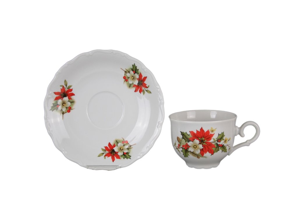 Praktický čajový šálek 0,18l s podšálkem z kvalitního českého porcelánu, bez barevného okraje (BB). Vhodný do myčky i mikrovlnné trouby.