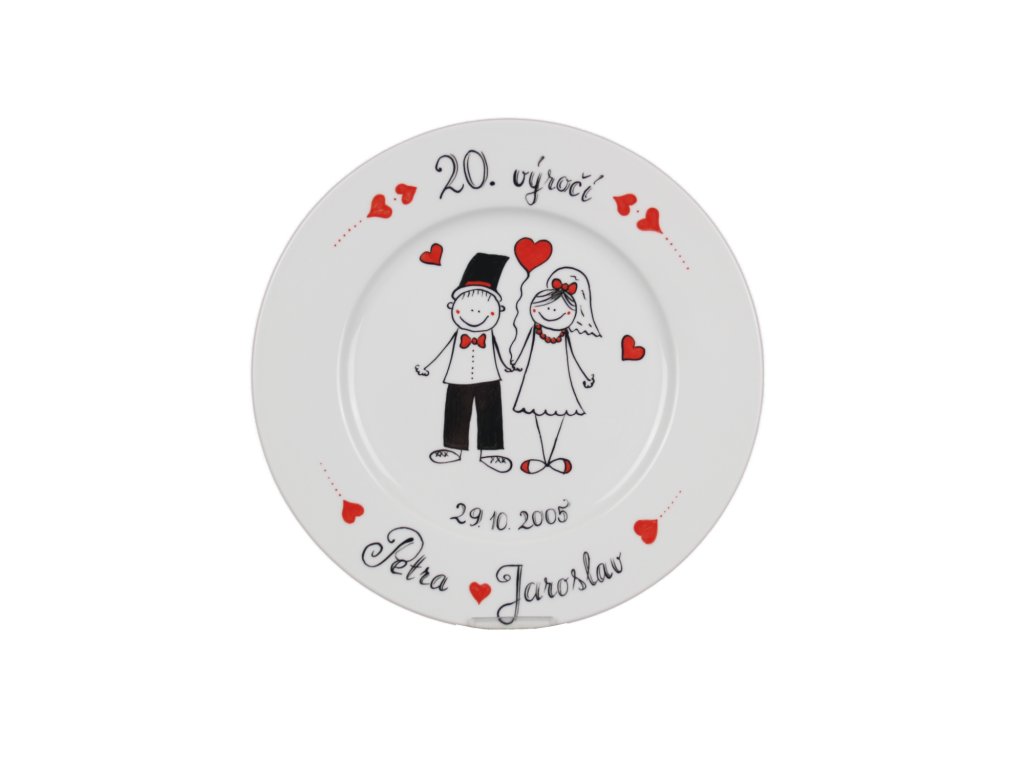 Originální ručně malovaný dárkový mělký talíř 25cm ke svatbě z kvalitního českého porcelánu, talíř má na zadní straně háček, pomocí kterého jej lze zavěsit na zeď.