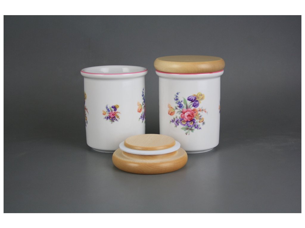 Praktická střední dóza s dřevěným uzávěrem z kvalitního českého porcelánu. Vhodná do myčky.