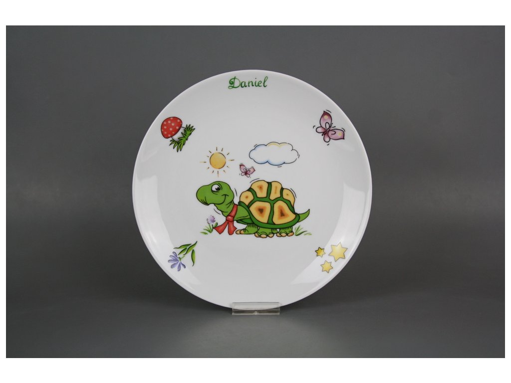 Ein origineller Kinderteller (21cm) aus hochwertigem tschechischem Porzellan mit dem handgeschriebenen Namen des Kindes. Dieser Teller ist sowohl für die Spülmaschine als auch für die Mikrowelle geeignet.