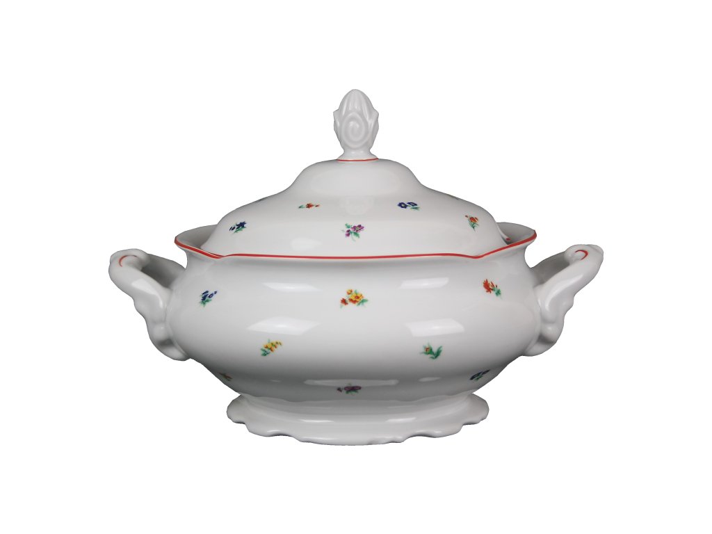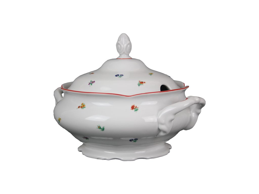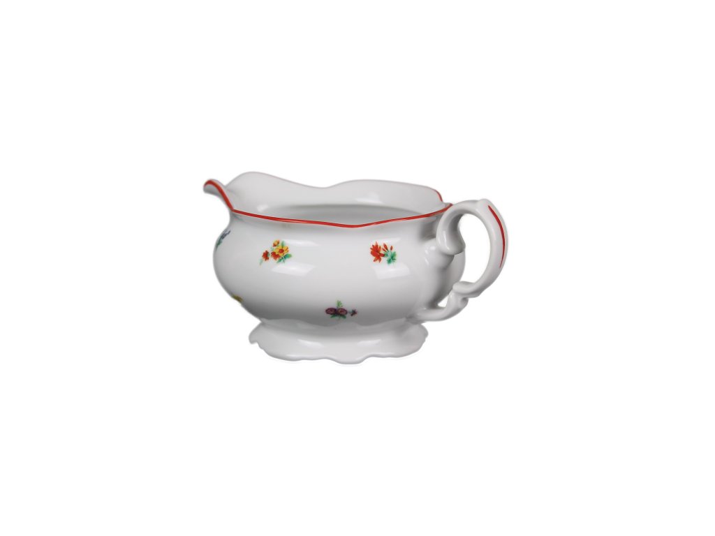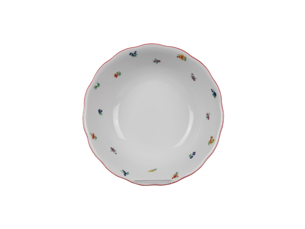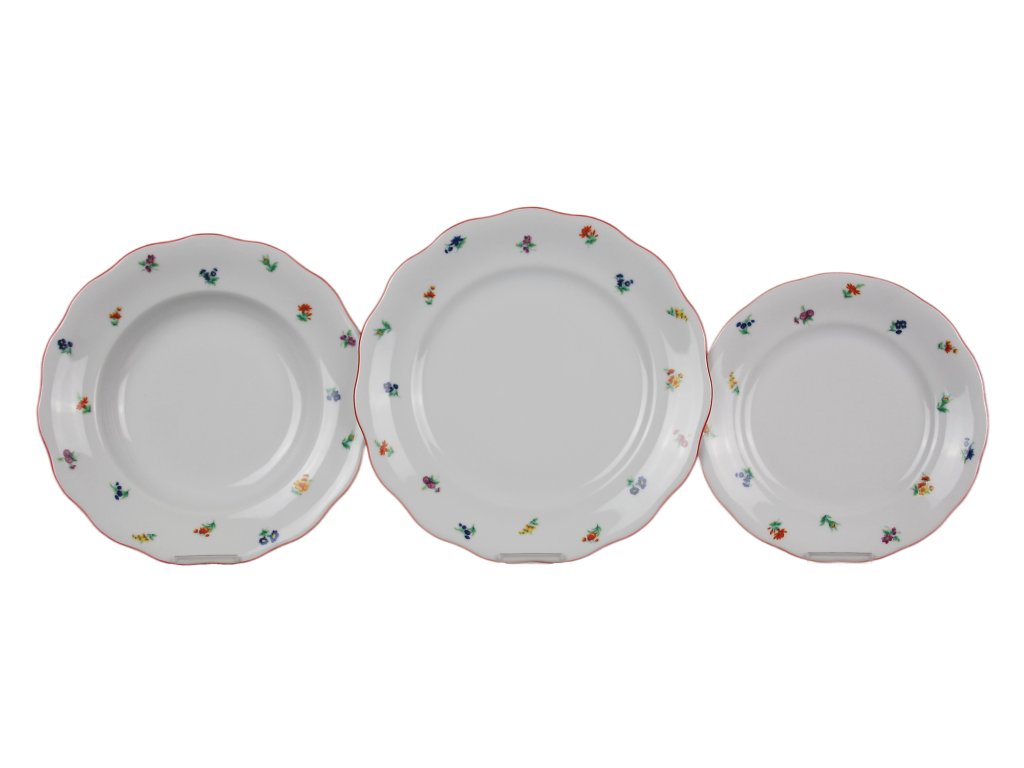 Praktická 26dílná jídelní souprava z kvalitního porcelánu, s červenými linkami na okrajích (CL). Vhodná do myčky i mikrovlnné trouby.