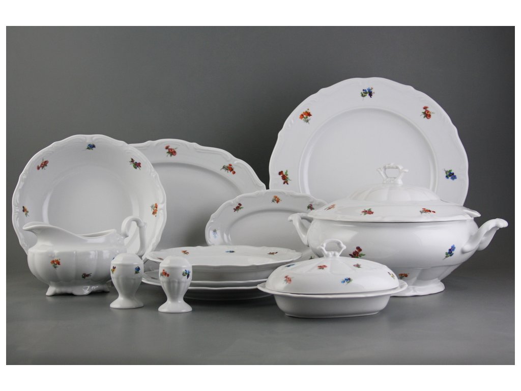 Praktická 28dílná jídelní souprava z kvalitního českého porcelánu. Vhodná do myčky i mikrovlnné trouby.