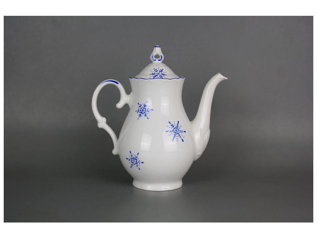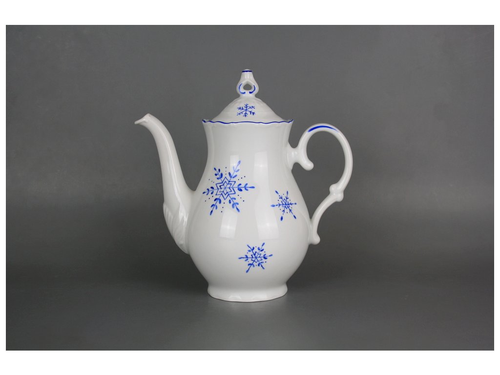 Ručně malovaná kávová konvice 1,2l z kvalitního českého porcelánu s motivem vánoční vločky, dekorace keramickou azurovou barvou (AL). Vločky je možné po dohodě namalovat i v jiném barevném provedení. Vhodná do myčky i mikrovlnné trouby.
