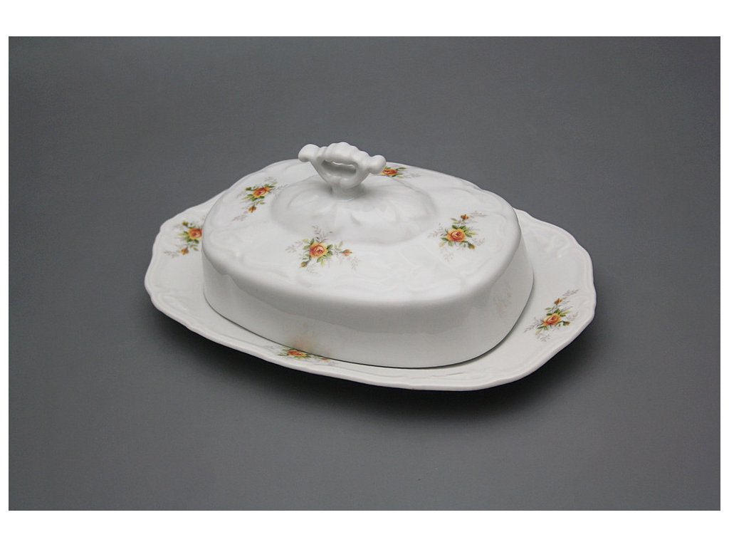 Luxusní 2dílná hranatá máslenka z kvalitního českého porcelánu, decentní jemný dekor v kombinaci s bohatým reliéfem. VHODNÁ do myčky i mikrovlnné trouby.