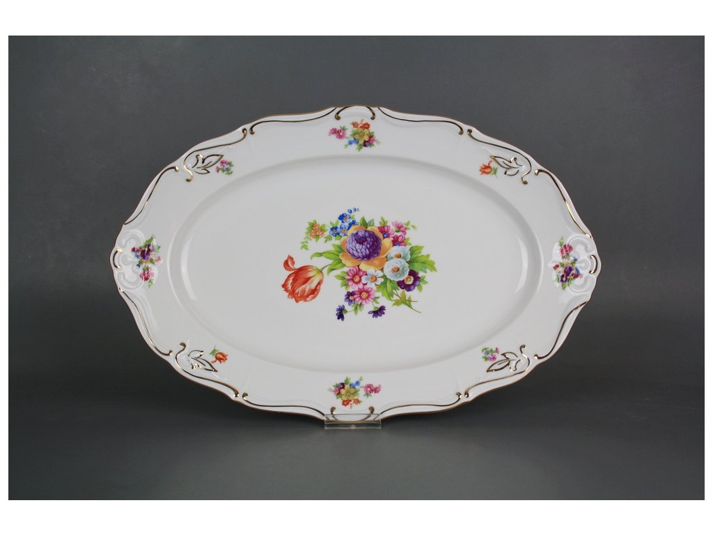 Luxusní ovál 32cm z kvalitního českého porcelánu, decentní jemný dekor v kombinaci s bohatou štafáží kvalitním lesklým 24karátovým zlatem, vysoký podíl ruční práce. NEVHODNÝ do myčky i mikrovlnné trouby.