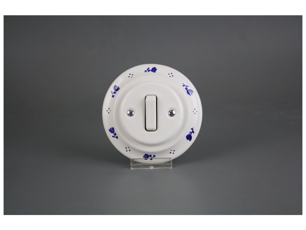 Kompletní ručně vyráběný i ručně malovaný kolébkový porcelánový vypínač č. 1 v retro stylu, kvalitní dekorace s teplotou výpalu 820 st. Celsia. Vypínač je dodáván včetně rámečku a je určen pro instalaci v interiéru do klasických elektroinstalačních krabic např. KP68 - průměr vrtaného otvoru 80mm, hloubka 43mm, pro vícenásobný rámeček je nutno dodržet rozteč středů 71 mm.