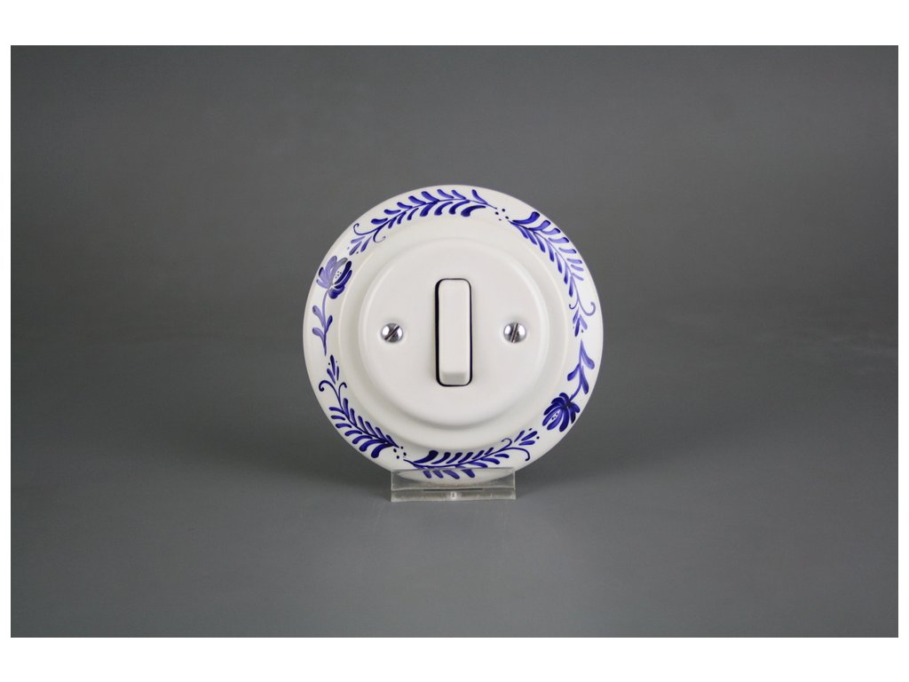 Kompletní ručně vyráběný i ručně malovaný kolébkový porcelánový vypínač č. 1 v retro stylu, kvalitní dekorace s teplotou výpalu 820 st. Celsia. Vypínač je dodáván včetně rámečku a je určen pro instalaci v interiéru do klasických elektroinstalačních krabic např. KP68 - průměr vrtaného otvoru 80mm, hloubka 43mm, pro vícenásobný rámeček je nutno dodržet rozteč středů 71 mm.