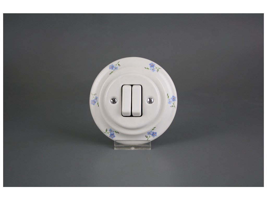Kompletní ručně vyráběný kolébkový porcelánový vypínač č. 5 (6+6) v retro stylu, kvalitní dekorace s teplotou výpalu 820 st. Celsia. Vypínač je dodáván včetně rámečku a je určen pro instalaci v interiéru do klasických elektroinstalačních krabic např. KP68 - průměr vrtaného otvoru 80mm, hloubka 43mm, pro vícenásobný rámeček je nutno dodržet rozteč středů 71 mm. Při použití spojovací krabice KP68 je tato potřebná rozteč zajištěna