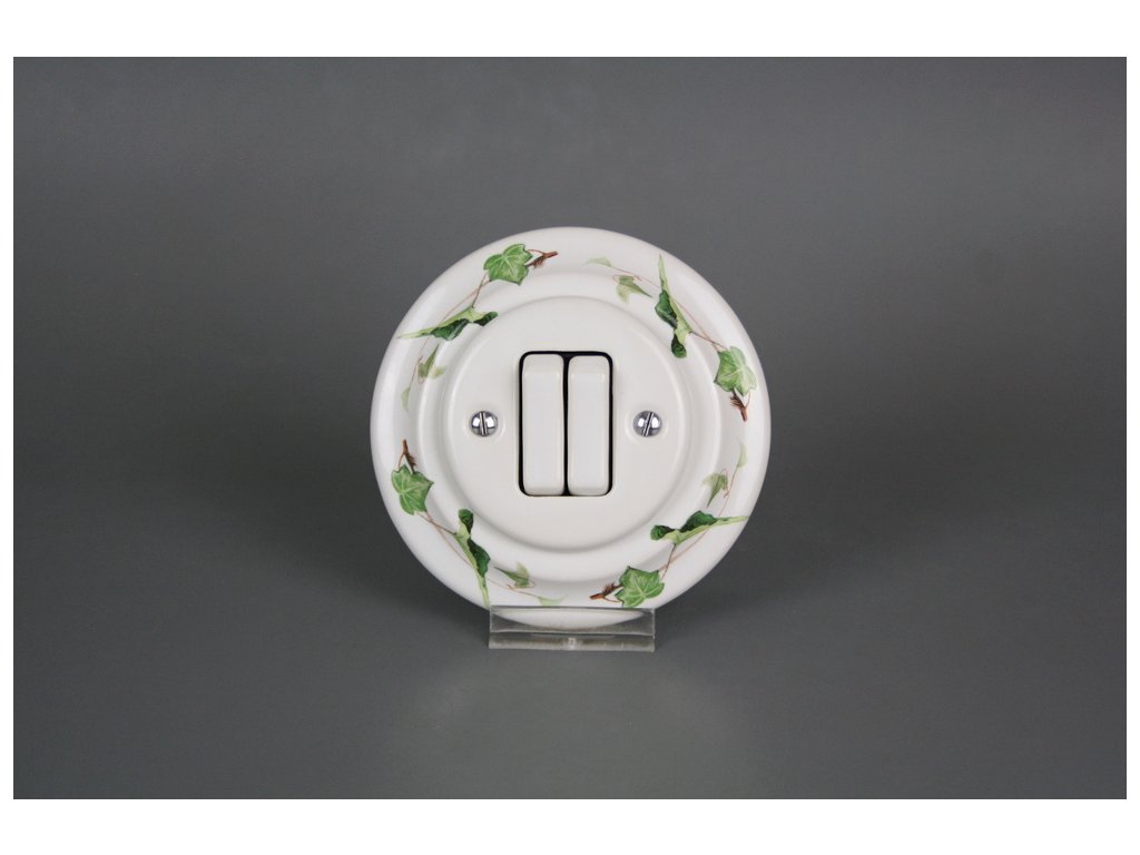 Kompletní ručně vyráběný kolébkový porcelánový vypínač č. 5 (6+6) v retro stylu, kvalitní dekorace s teplotou výpalu 820 st. Celsia. Vypínač je dodáván včetně rámečku a je určen pro instalaci v interiéru do klasických elektroinstalačních krabic, např. KP68 - průměr vrtaného otvoru 80mm, hloubka 43mm, pro vícenásobný rámeček je nutno dodržet rozteč středů 71 mm. Při použití spojovací krabice KP68 je tato potřebná rozteč zajištěna.