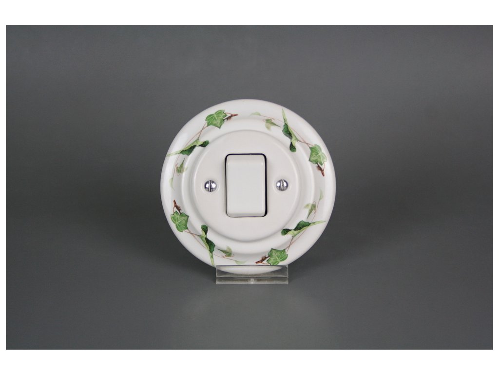 Kompletní ručně vyráběný kolébkový porcelánový vypínač č. 7 v retro stylu, kvalitní dekorace s teplotou výpalu 820 st. Celsia. Vypínač je dodáván včetně rámečku a je určen pro instalaci v interiéru do klasických elektroinstalačních krabic např. KP68 - průměr vrtaného otvoru 80mm, hloubka 43mm, pro vícenásobný rámeček je nutno dodržet rozteč středů 71 mm.