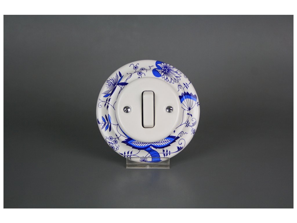 Kompletní ručně vyráběný kolébkový porcelánový zvonkový vypínač v retro stylu, kvalitní dekorace s teplotou výpalu 820 st. Celsia. Vypínač je dodáván včetně rámečku a je určen pro instalaci do klasických elektroinstalačních krabic např. KP68 - průměr vrtaného otvoru 80mm, hloubka 43mm, pro vícenásobný rámeček je nutno dodržet rozteč středů 71 mm, vysoká odolnost proti otěru.