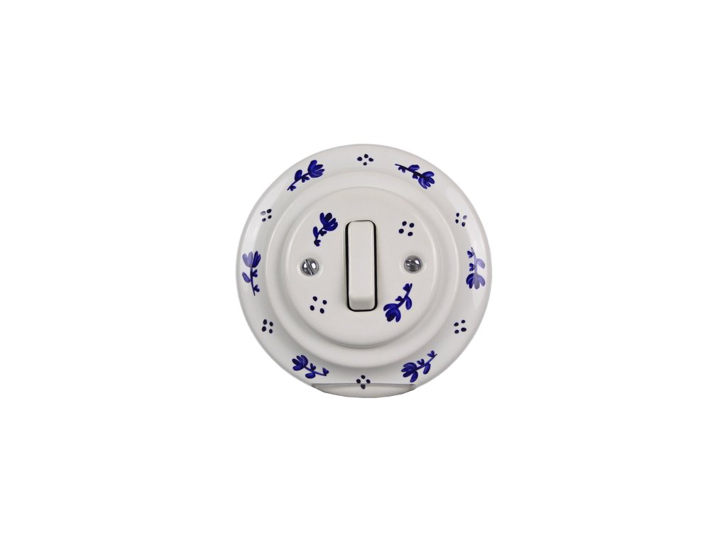 Kompletní ručně vyráběný i ručně malovaný kolébkový porcelánový zvonkový vypínač v retro stylu, kvalitní dekorace s teplotou výpalu 820 st. Celsia. Vypínač je dodáván včetně rámečku a je určen pro instalaci do klasických elektroinstalačních krabic např. KP68 - průměr vrtaného otvoru 80mm, hloubka 43mm, pro vícenásobný rámeček je nutno dodržet rozteč středů 71 mm, vysoká odolnost proti otěru.