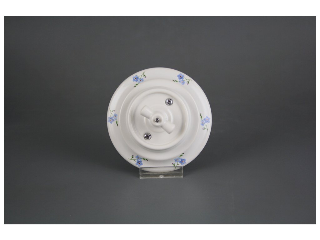 Kompletní ručně vyráběný otočný porcelánový vypínač zvonkový v retro stylu, kvalitní dekorace s teplotou výpalu 820 st. Celsia. Vypínač je dodáván včetně rámečku a je určen pro instalaci v interiéru do klasických elektroinstalačních krabic např. KP68 - průměr vrtaného otvoru 80mm, hloubka 43mm, pro vícenásobný rámeček je nutno dodržet rozteč středů 71 mm.