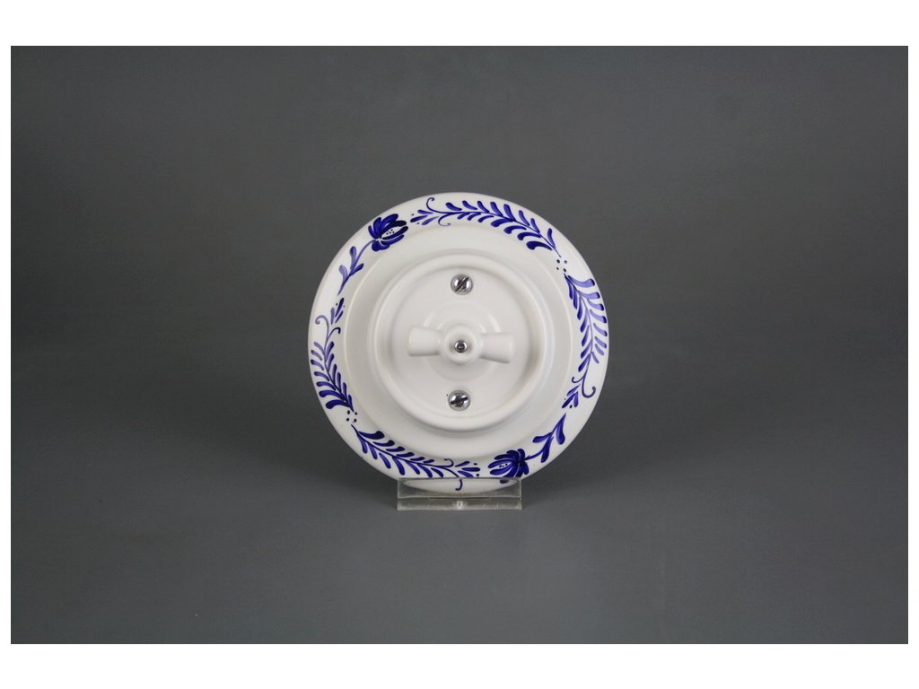 Kompletní ručně vyráběný i ručně malovaný otočný porcelánový vypínač zvonkový v retro stylu, kvalitní dekorace s teplotou výpalu 820 st. Celsia. Vypínač je dodáván včetně rámečku a je určen pro instalaci v interiéru do klasických elektroinstalačních krabic např. KP68 - průměr vrtaného otvoru 80mm, hloubka 43mm, pro vícenásobný rámeček je nutno dodržet rozteč středů 71 mm.