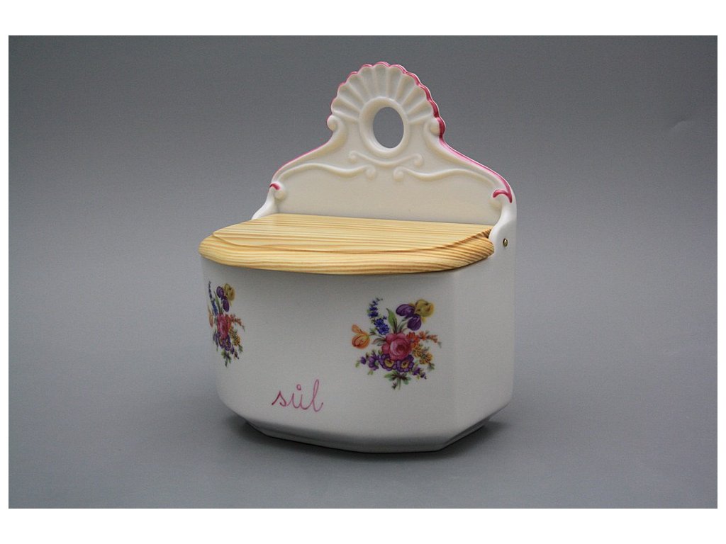 Praktische Salzdose mit Holzdeckel zum Aufhängen, gefertigt aus böhmischem Markenporzellan von höchster Qualität.
