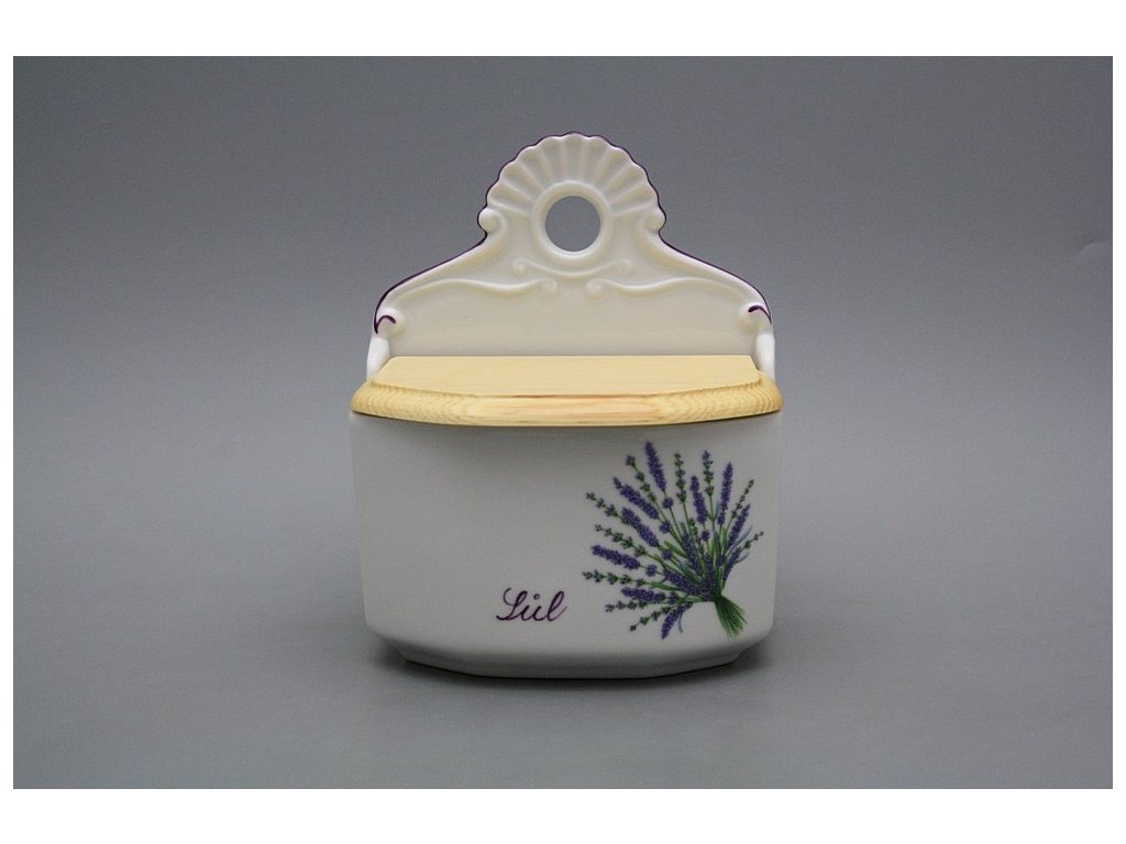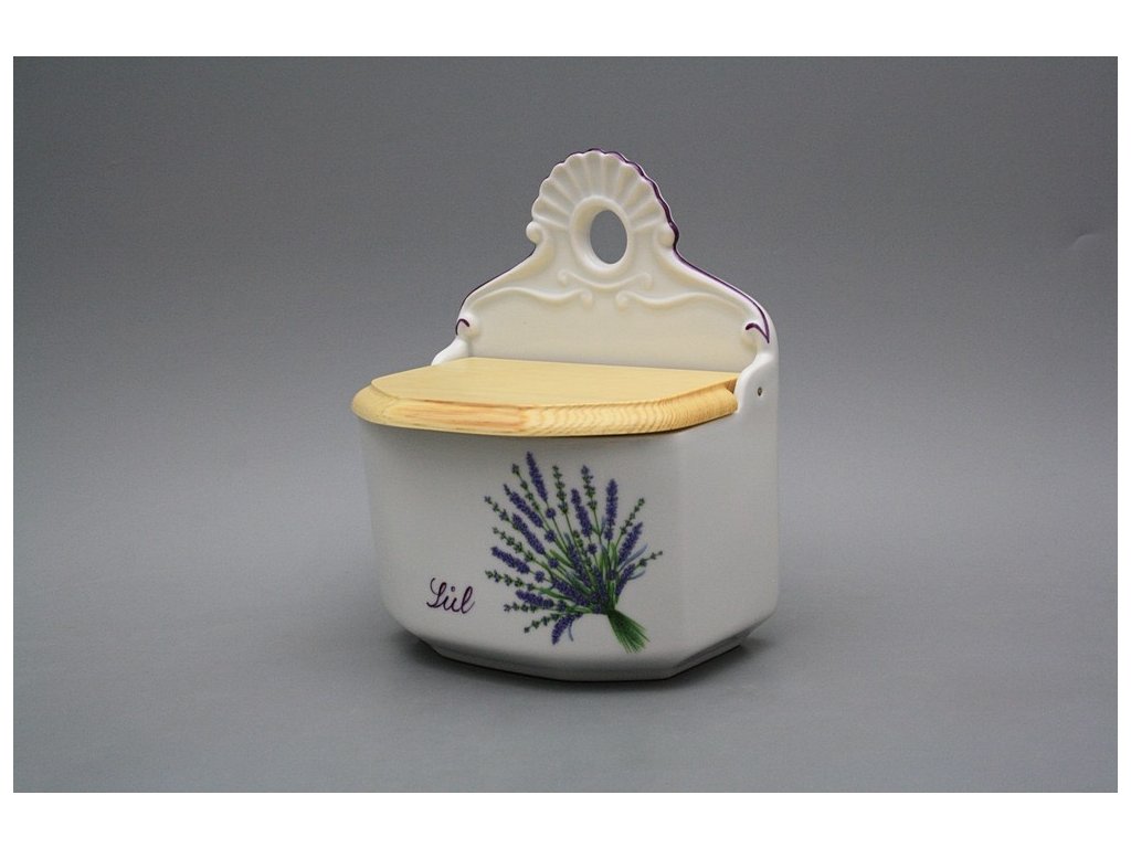 Praktische Salzdose mit Holzdeckel zum Aufhängen, gefertigt aus böhmischem Markenporzellan von höchster Qualität.