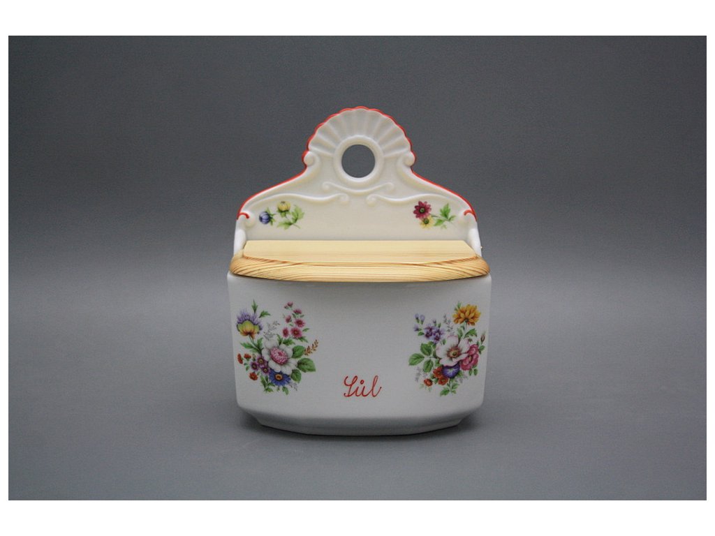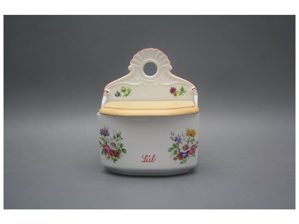 Praktische Salzdose mit Holzdeckel zum Aufhängen, gefertigt aus böhmischem Markenporzellan von höchster Qualität.