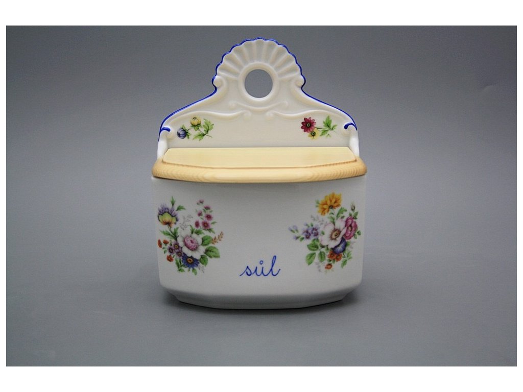 Praktische Salzdose mit Holzdeckel zum Aufhängen, gefertigt aus böhmischem Markenporzellan von höchster Qualität.