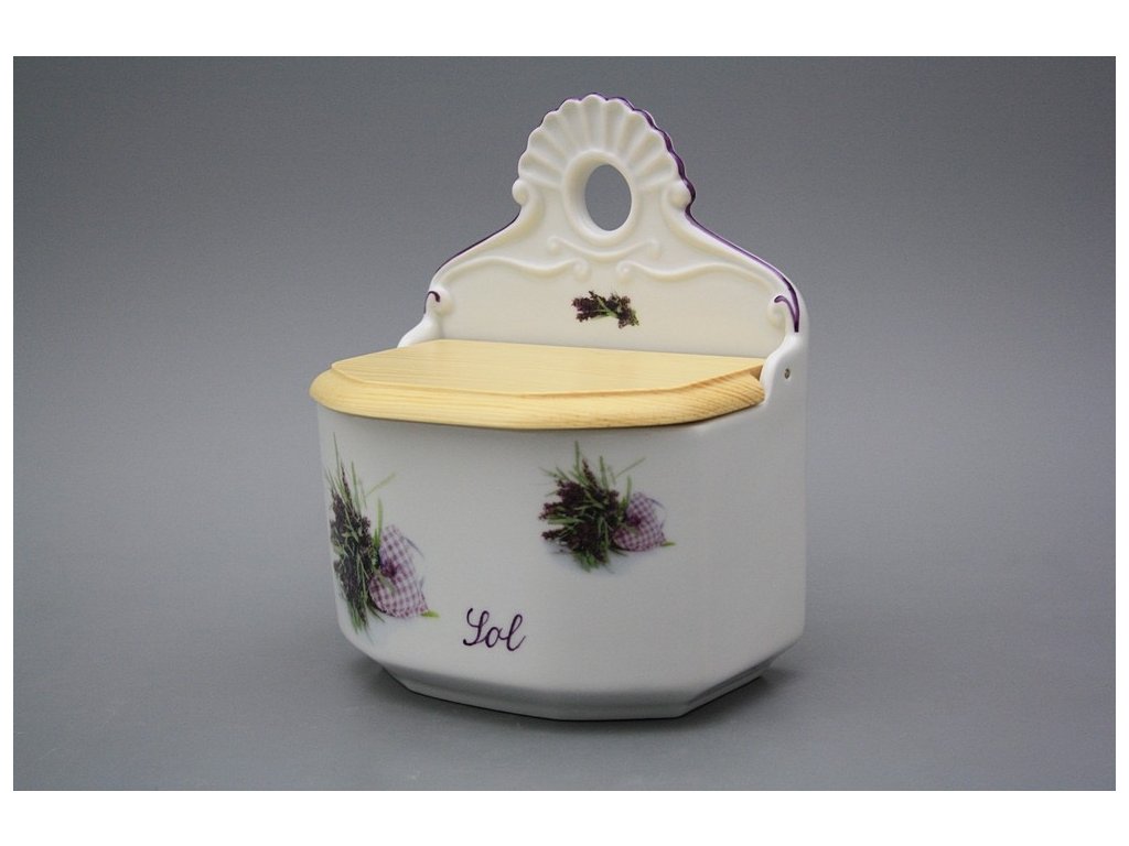 Praktische Salzdose mit Holzdeckel zum Aufhängen, gefertigt aus böhmischem Markenporzellan von höchster Qualität.