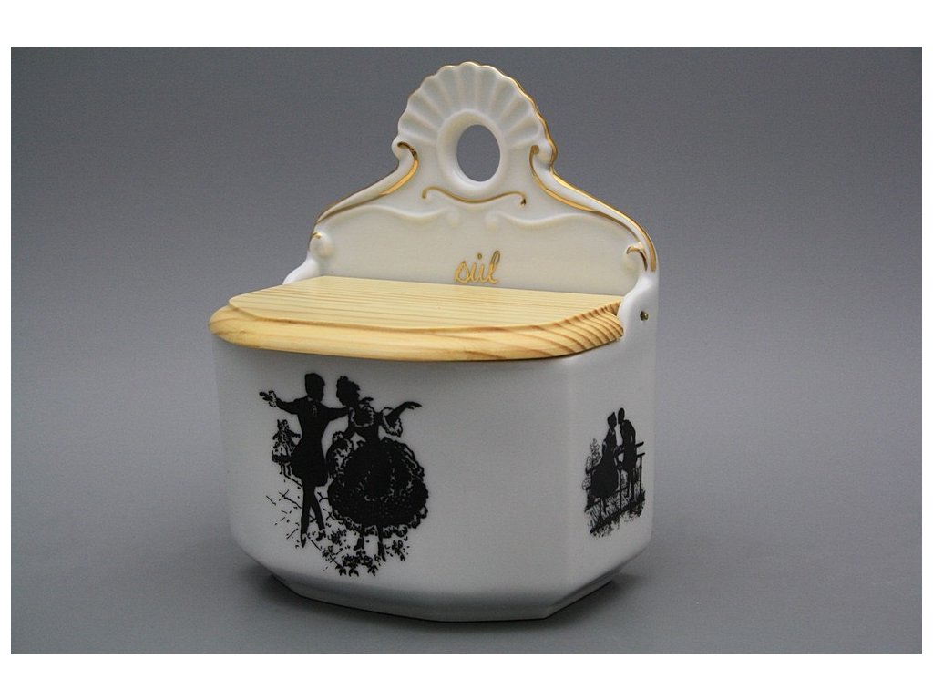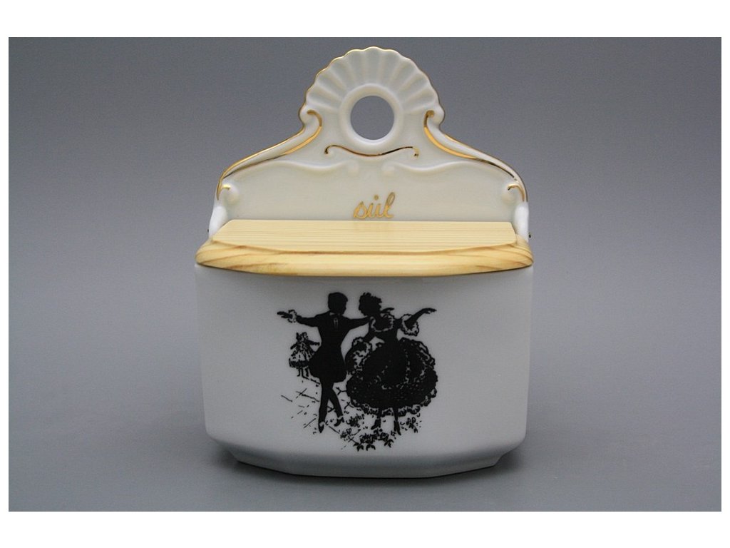 Praktische Salzdose mit Holzdeckel zum Aufhängen, gefertigt aus böhmischem Markenporzellan von höchster Qualität.