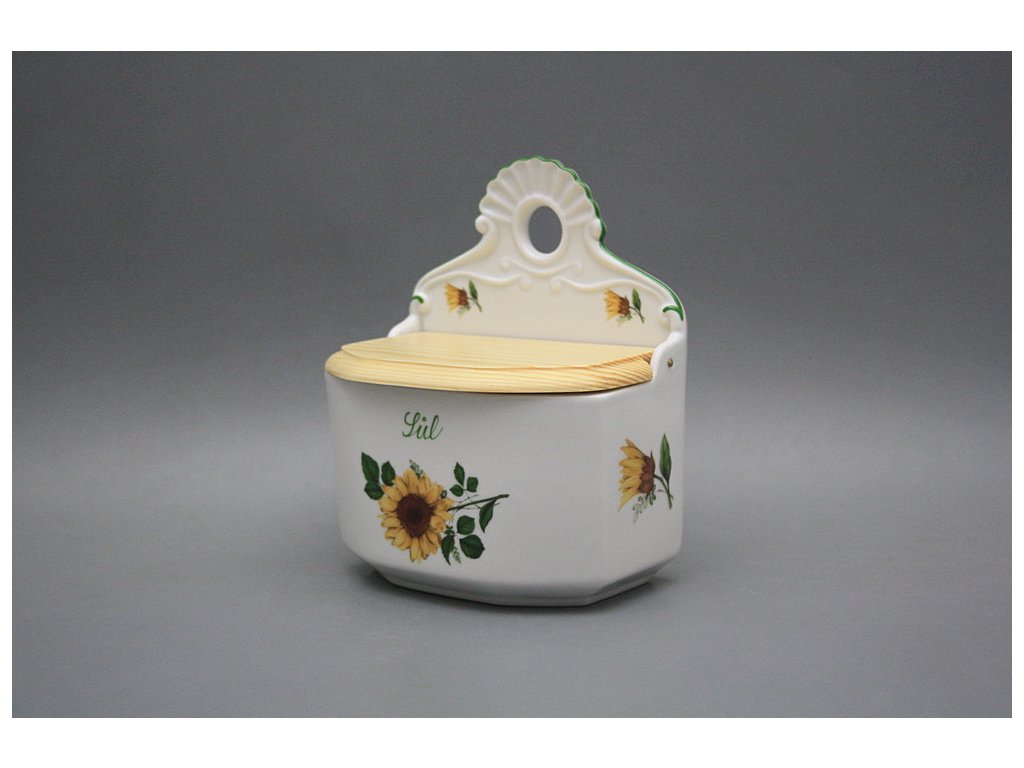 Praktische Salzdose mit Holzdeckel zum Aufhängen, gefertigt aus böhmischem Markenporzellan von höchster Qualität.