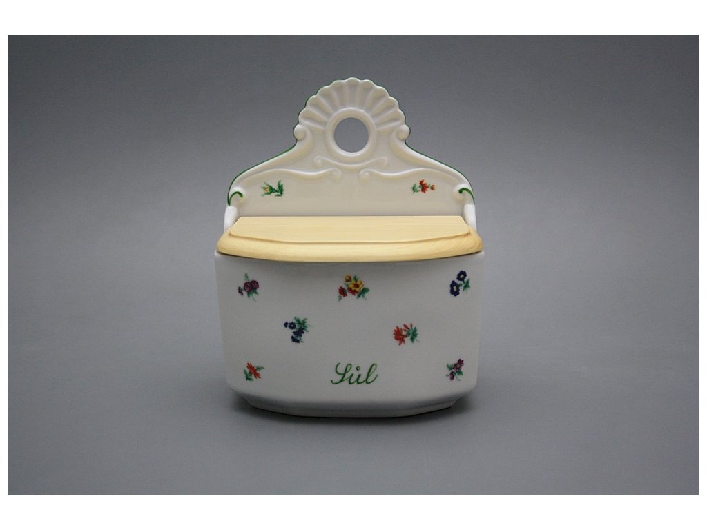 Praktische Salzdose mit Holzdeckel zum Aufhängen, gefertigt aus böhmischem Markenporzellan von höchster Qualität.