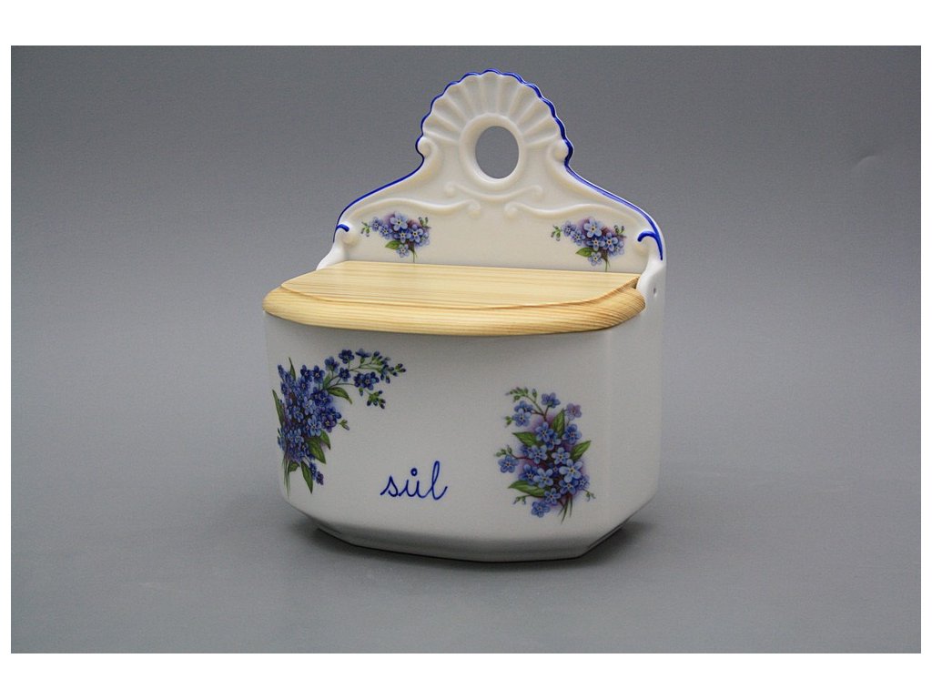 Praktische Salzdose mit Holzdeckel zum Aufhängen, gefertigt aus böhmischem Markenporzellan von höchster Qualität.