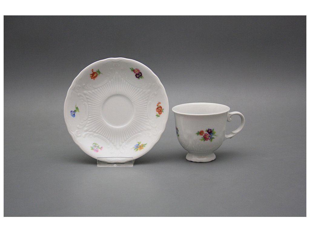 Luxusní šálek 0,08l s podšálkem 16cm z kvalitního českého porcelánu. Vhodný do myčky i mikrovlnné trouby.