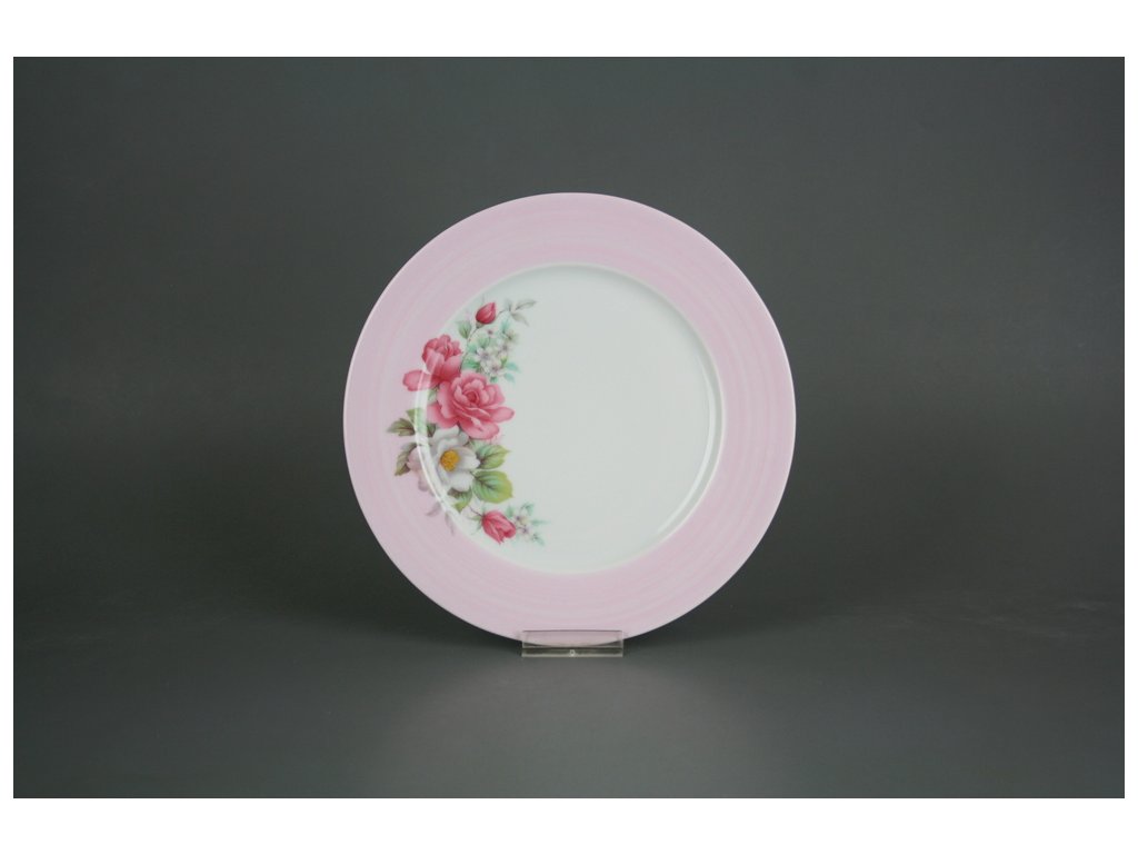 Luxusní praktický dezertní talíř 19,5cm s vysokým podílem ruční práce z kvalitního českého porcelánu, ručně malovaný okraj (prapor) růžovou barvou (RP). VHODNÝ do myčky i mikrovlnné trouby.