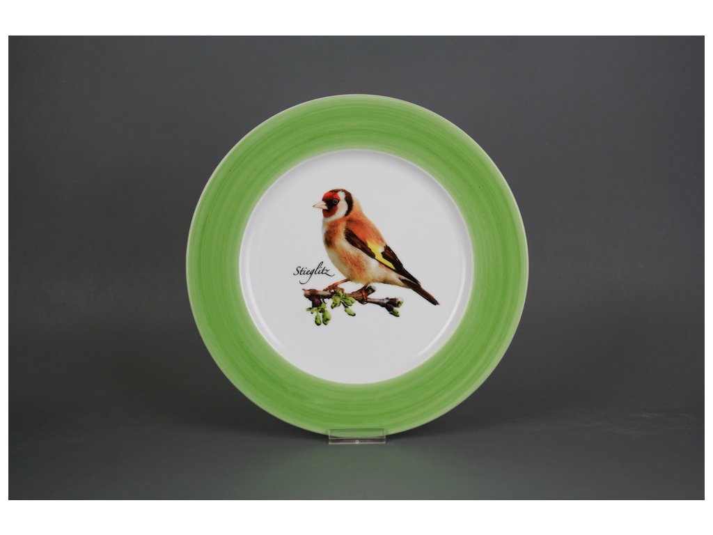 Luxusní praktický mělký talíř 25cm s vysokým podílem ruční práce z kvalitního českého porcelánu, ručně malovaný okraj (prapor) zelenou barvou (ZP). VHODNÝ do myčky i mikrovlnné trouby.
