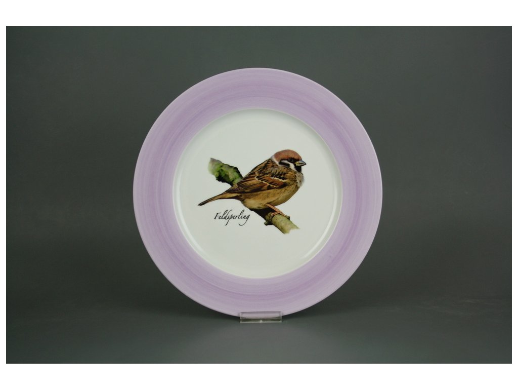 Luxusní praktický mělký talíř 25cm s vysokým podílem ruční práce z kvalitního českého porcelánu, ručně malovaný okraj (prapor) fialovou barvou (FP). VHODNÝ do myčky i mikrovlnné trouby.