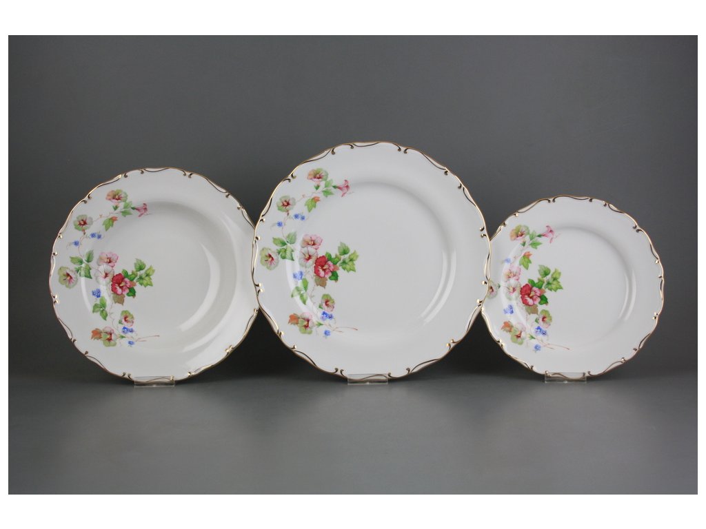 Luxusní 18dílná talířová souprava z kvalitního českého porcelánu, ruční dekorace kvalitním lesklým zlatem. Nevhodná do myčky i mikrovlnné trouby.