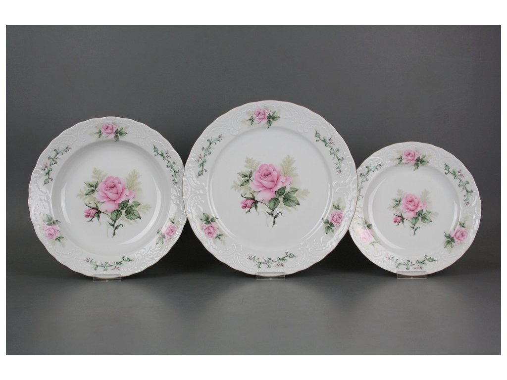 Luxusní reliéfní 24dílná talířová souprava z kvalitního českého porcelánu, dekorace platinou. NEVHODNÁ do myčky i mikrovlnné trouby.